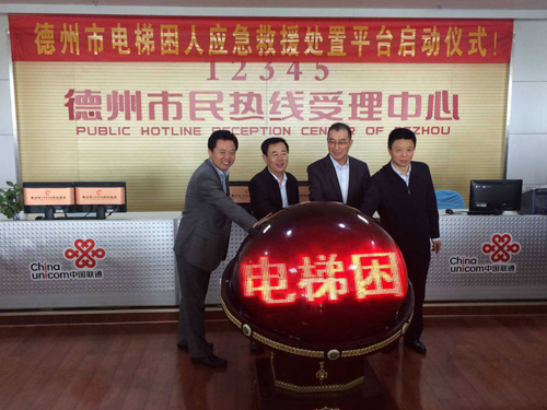 该项目自2016年3月开始筹备,由德州市质监局和市政府热线办负责德州市电梯困人应急救援处置平台建设,呼叫中心设置在12345市民热线受理中心,由专席专人负责处置。电梯发生故障时,轿箱内被困乘客可按下报警键通知电梯使用单位,当使用单位未响应时,可通过手机拨打该电梯维保单位电话,也可拨打市民热线“12345”,被困乘客向接线员报出电梯识别码,接线员即可定位电梯所处详细位置。
